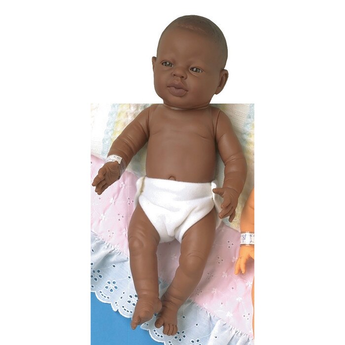 These preemie models are anatomically correct (males have foreskin intact) and show the wrinkling typical of a tiny baby’s skin. Each model comes with a diaper with Velcro fasteners, a hospital identification bracelet, and a birth certificate. 17" long; 1 lb, 10 oz.